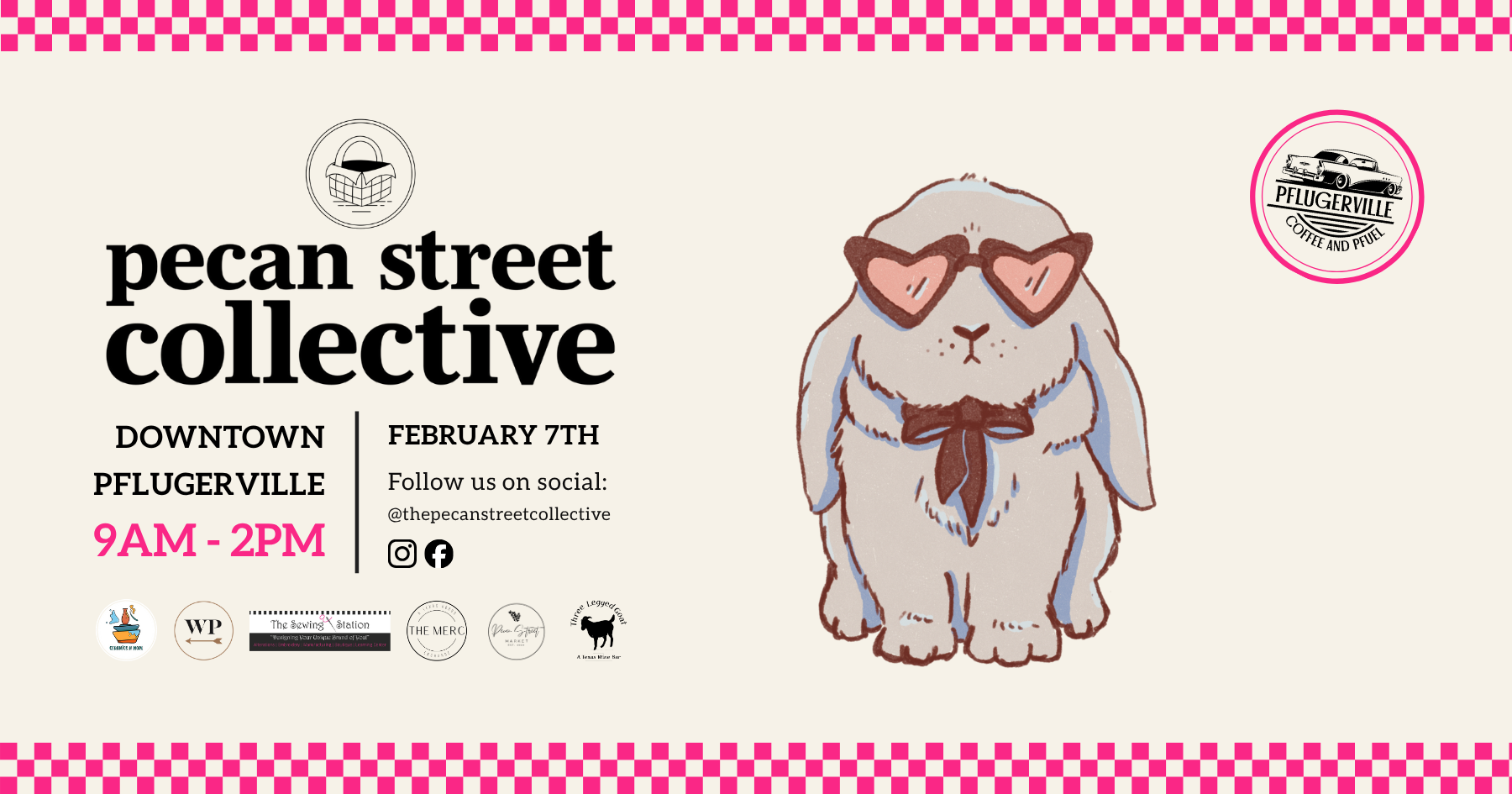 Back to All Events February Market Saturday, February 7, 2026 9:00 AM 2:00 PM Google Calendar ICS The next maker’s market at the Pecan Street Collective will be on Saturday, February 7th, 2026 from 9 am to 2 pm in Downtown Pflugerville. Follow us @thepecanstreetcollective for updates!February Collective Vendors